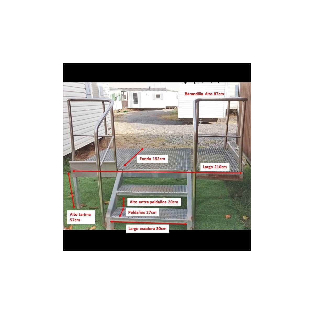 Escalera de acero galvanizado con plataforma de 210x132cm. Entrada frontal. Barandilla de inox con y escalera con 3 peldaños. Escalera para mobilhome o bungalow.