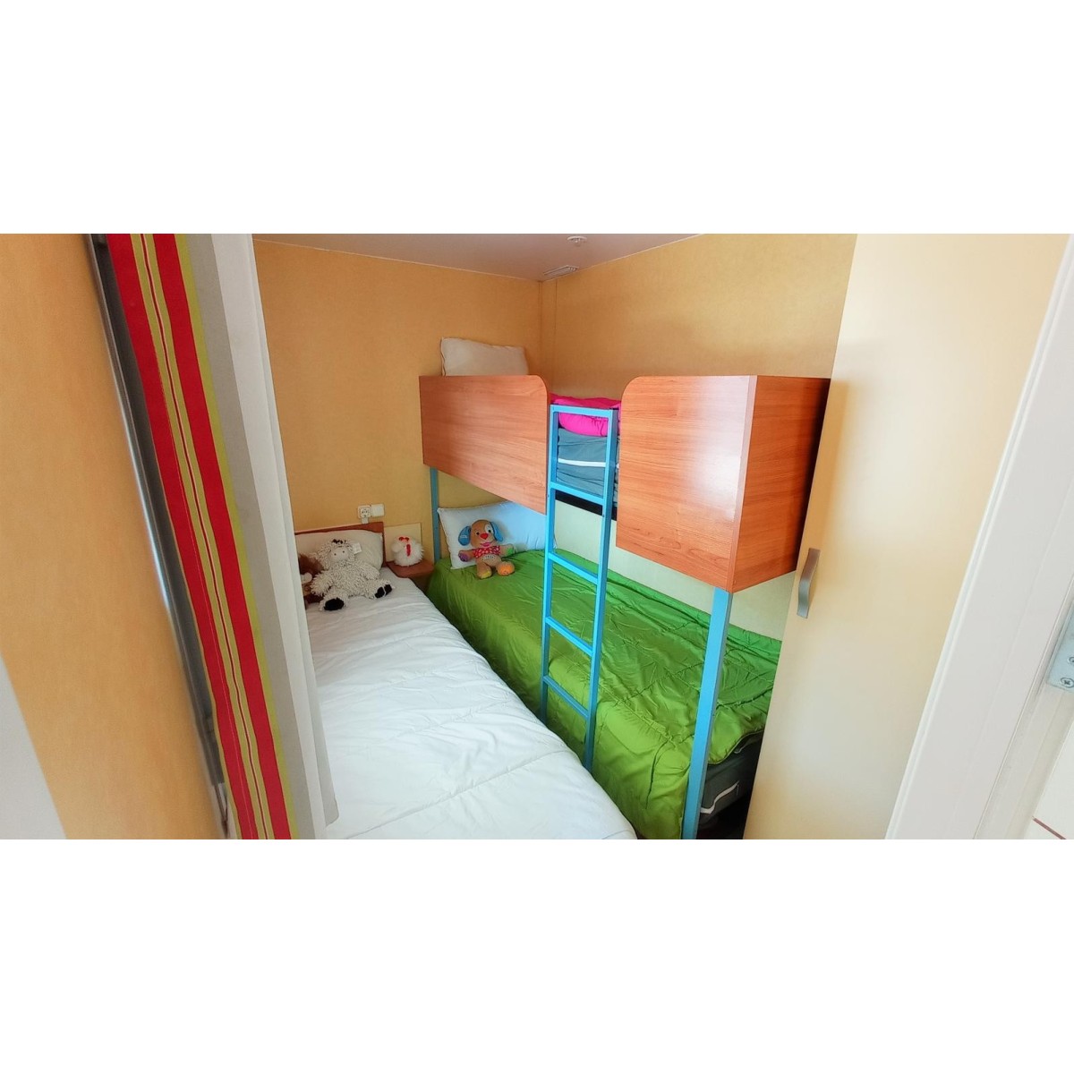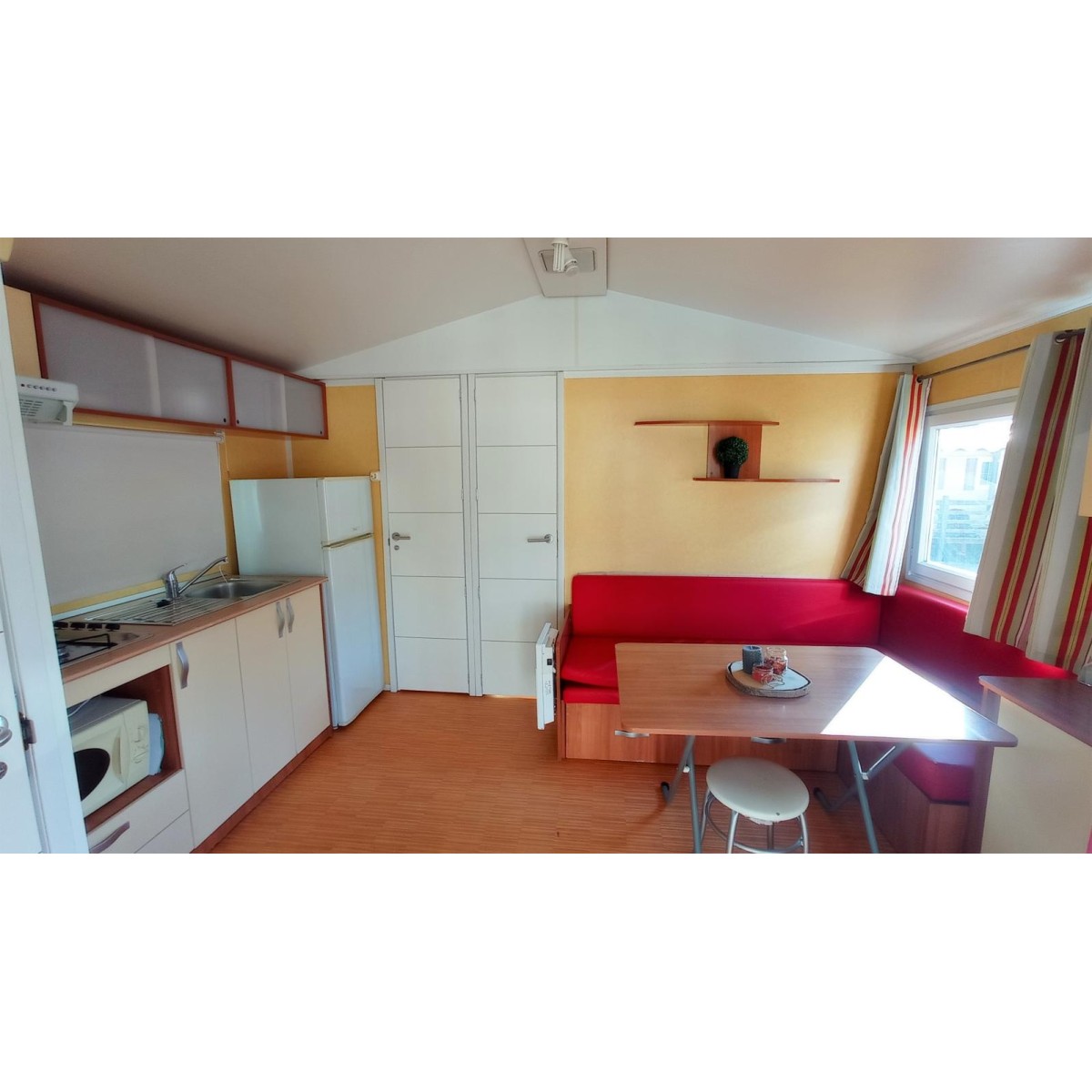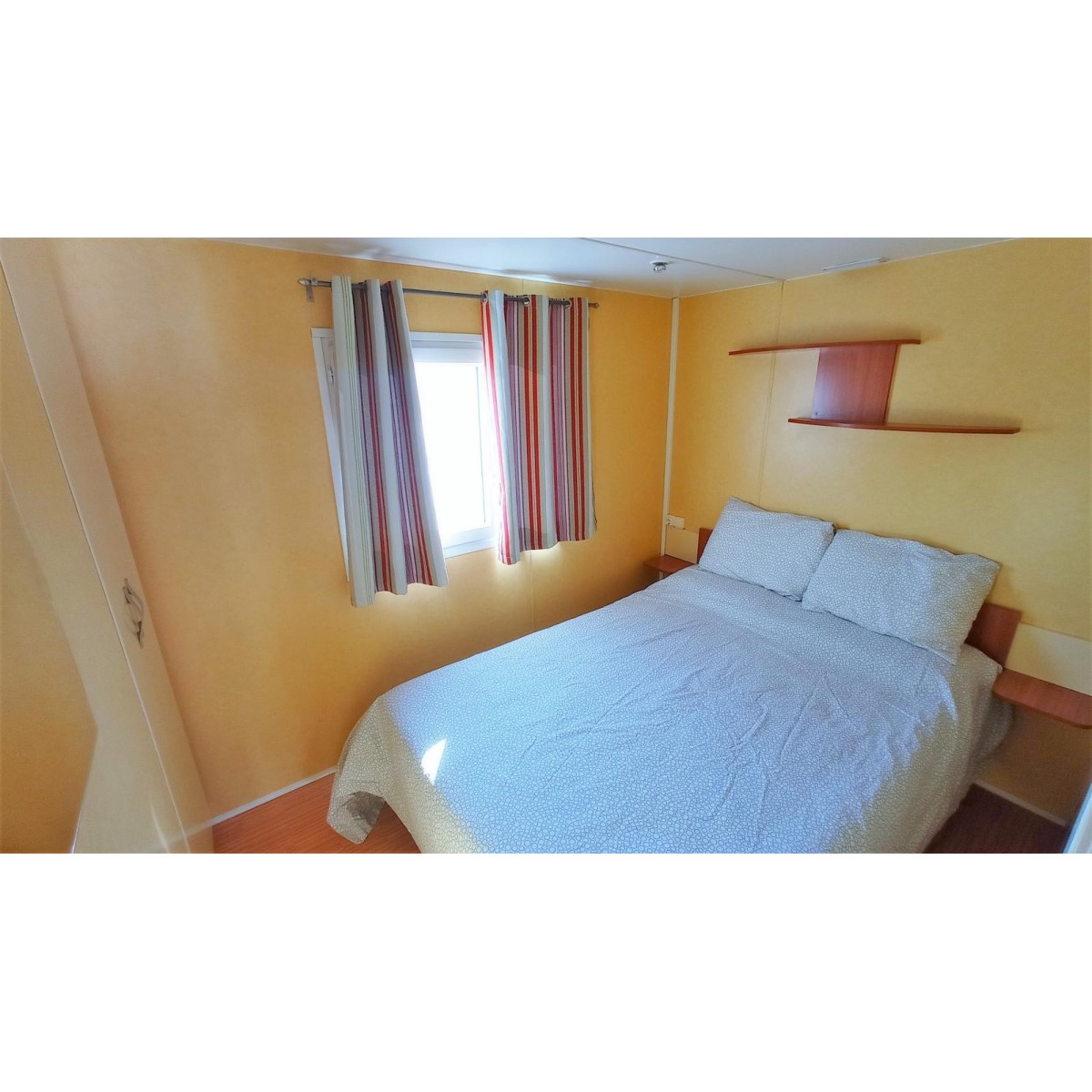 Modelo para 5/8 personas. Con dos habitaciones y sofá cama. Habitación doble espaciosa. Segunda habitación con una cama individual y una litera. Comedor muy luminoso. Cocina de gas. Calentador de gas. Doble acristalamiento en las ventanas. Frigorífico mediano. Baño estilo francés. Calefacción eléctrica en el comedor. Entrada con puerta a dos hojas que se abre totalmente permitiendo juntar el espacio del comedor y la terraza.
