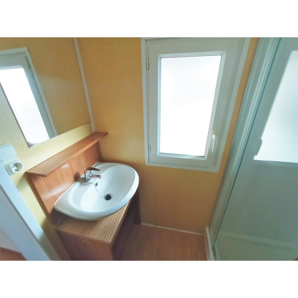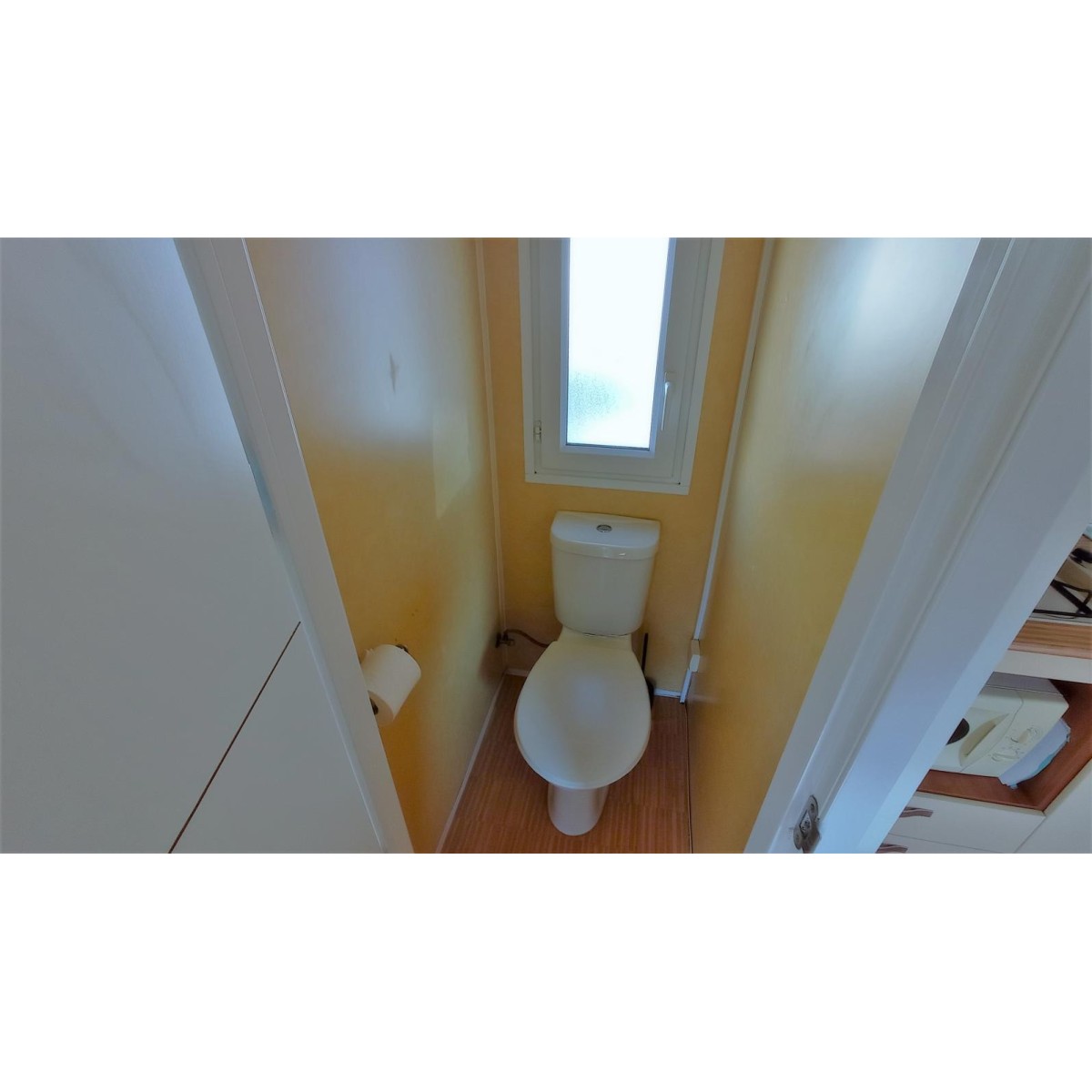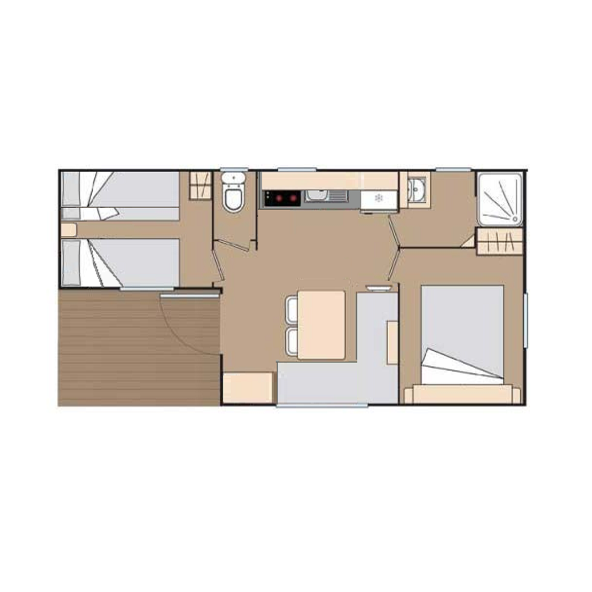 Modelo para 5/8 personas. Con dos habitaciones y sofá cama. Habitación doble espaciosa. Segunda habitación con una cama individual y una litera. Comedor muy luminoso. Cocina de gas. Calentador de gas. Doble acristalamiento en las ventanas. Frigorífico mediano. Baño estilo francés. Calefacción eléctrica en el comedor. Entrada con puerta a dos hojas que se abre totalmente permitiendo juntar el espacio del comedor y la terraza.