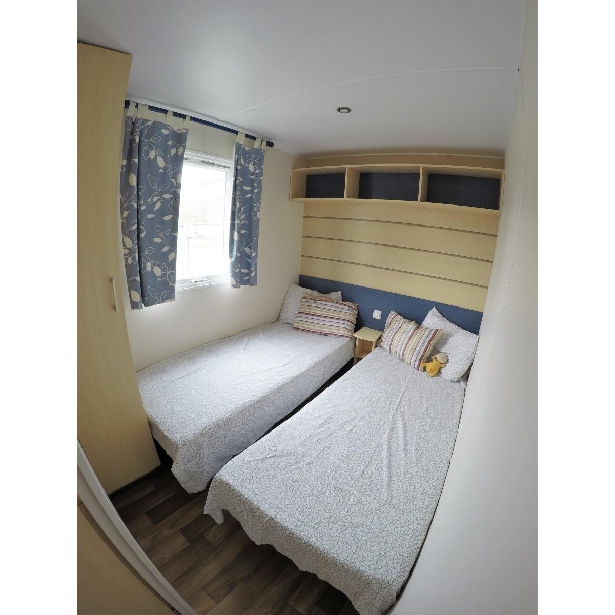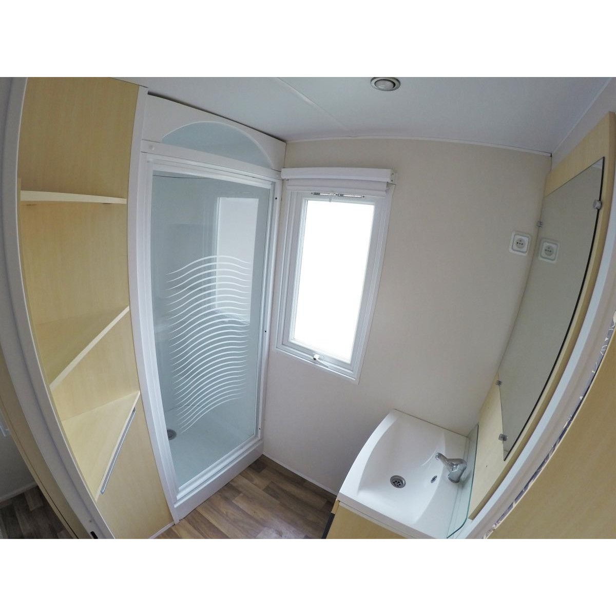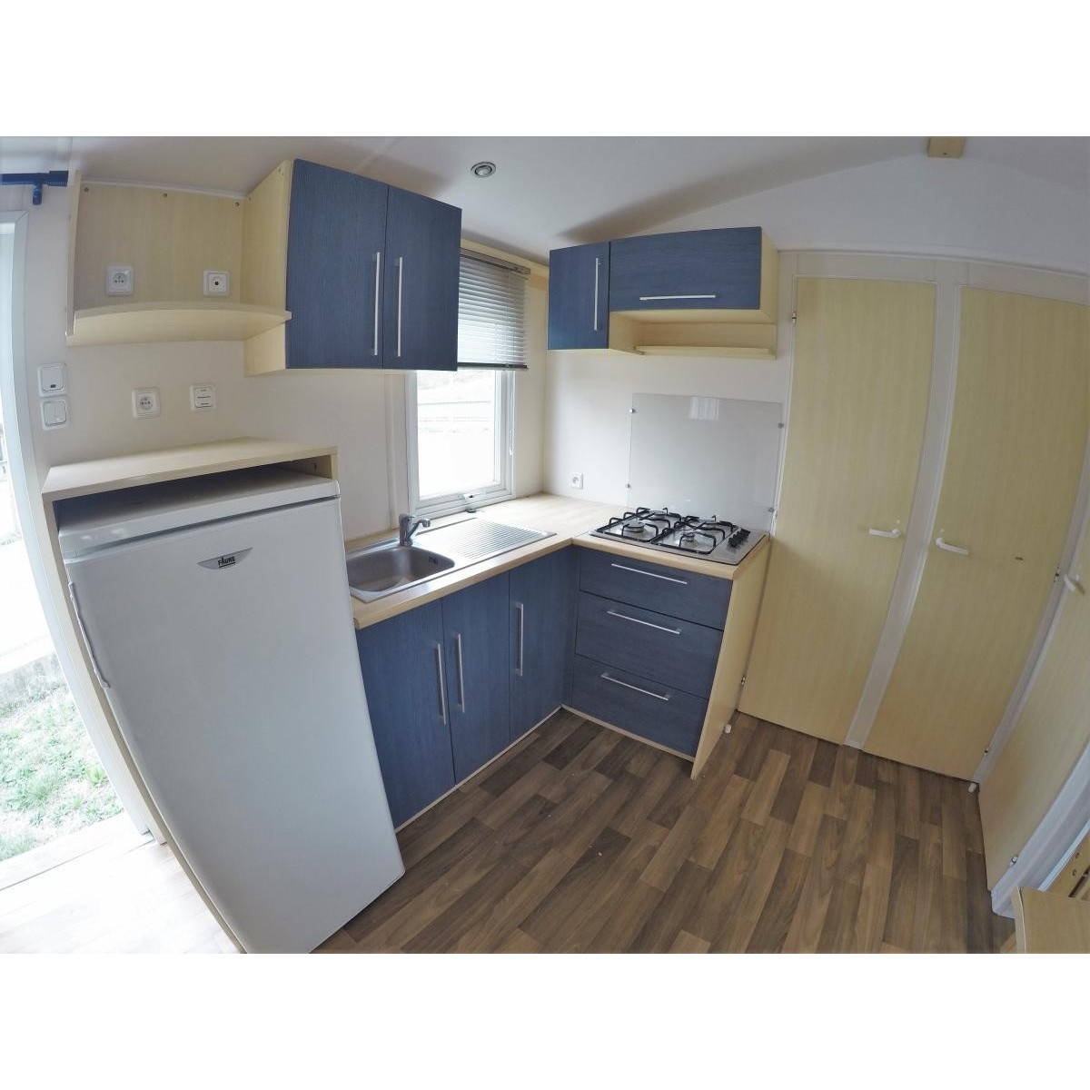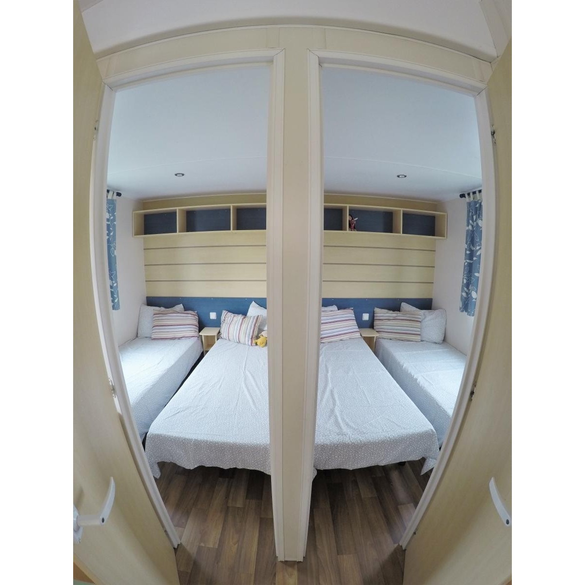 Modelo para 6/8 personas. Con tres habitaciones, una doble y las otras dos con camas individuales. Comedor espacioso con sofá cama. Cocina de gas. Calentador de gas o eléctrico. Doble acristalamiento en las ventanas. Frigorífico. Baño estilo francés. Calefacción eléctrica en el comedor.