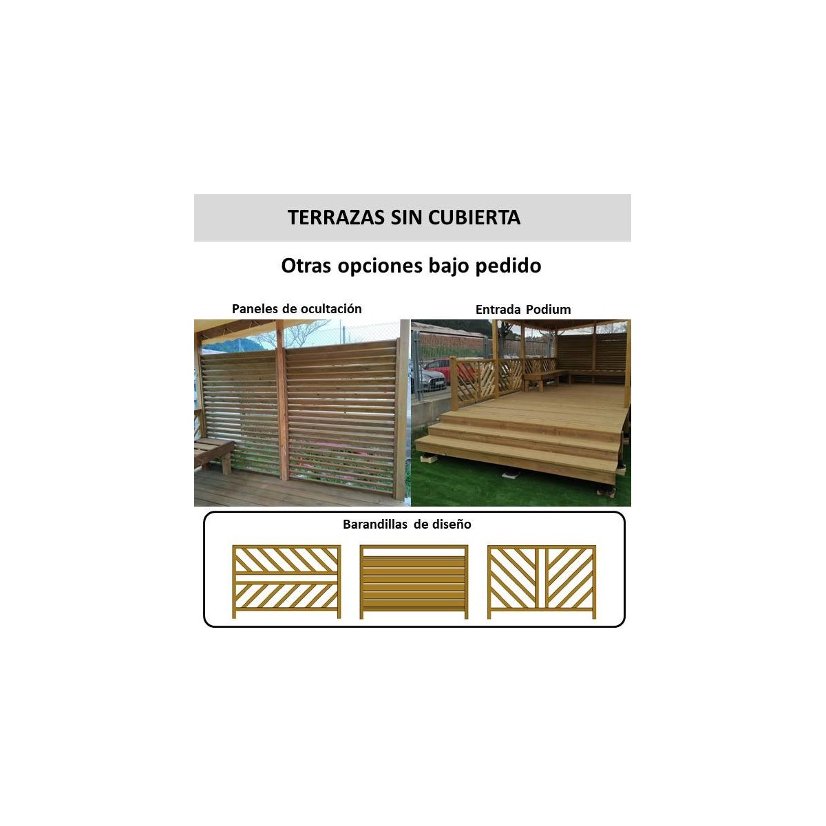 Opciones bajo pedido: cubierta con toldo, barandillas de diseño, entrada podium y paneles de ocultación. También se pueden fabricar otras medidas. Consúltanos.